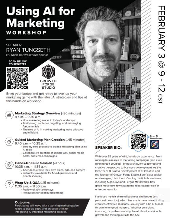 Speaker: Ryan Tungseth, Founder of Growth Forge Studio Bring your laptop and get ready to level up your marketing game with the latest AI strategies and tips at this hands-on workshop! Outcome: Participants will leave with a working marketing plan, ready-to-use ad copy and practical skills for integrating AI into their marketing process.