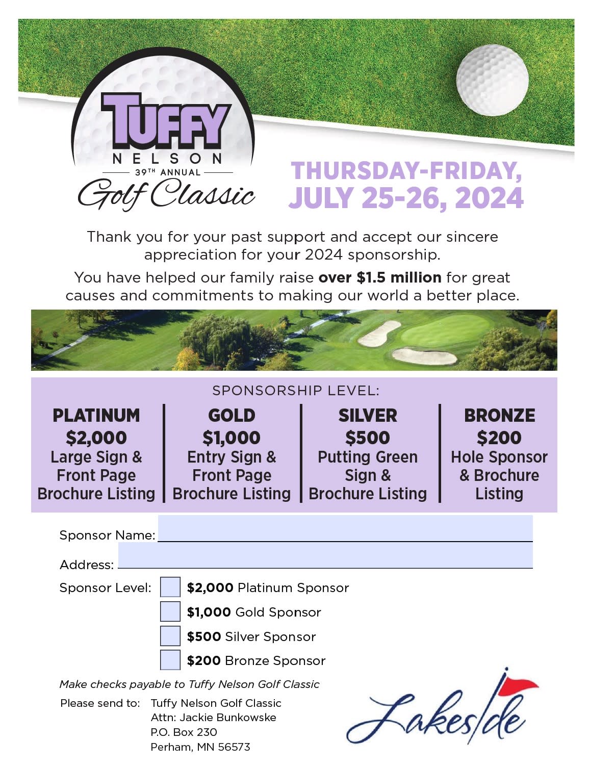 This year’s format and event will be a bit different. The 2024 Tuffy’s Golf Classic will feature three day/time options for golf. You can choose one, two or three times to play. The first shotgun will be on Thursday July 25th at 1:00pm, the second on Friday morning, July 26th at 8:00am and the third on Friday afternoon at 1:00pm. Lunch and dinner will be provided for golfers on both Thursday and Friday. Regardless of which day/time you choose to play, all golfers are welcome to join us for Friday’s prime rib dinner.